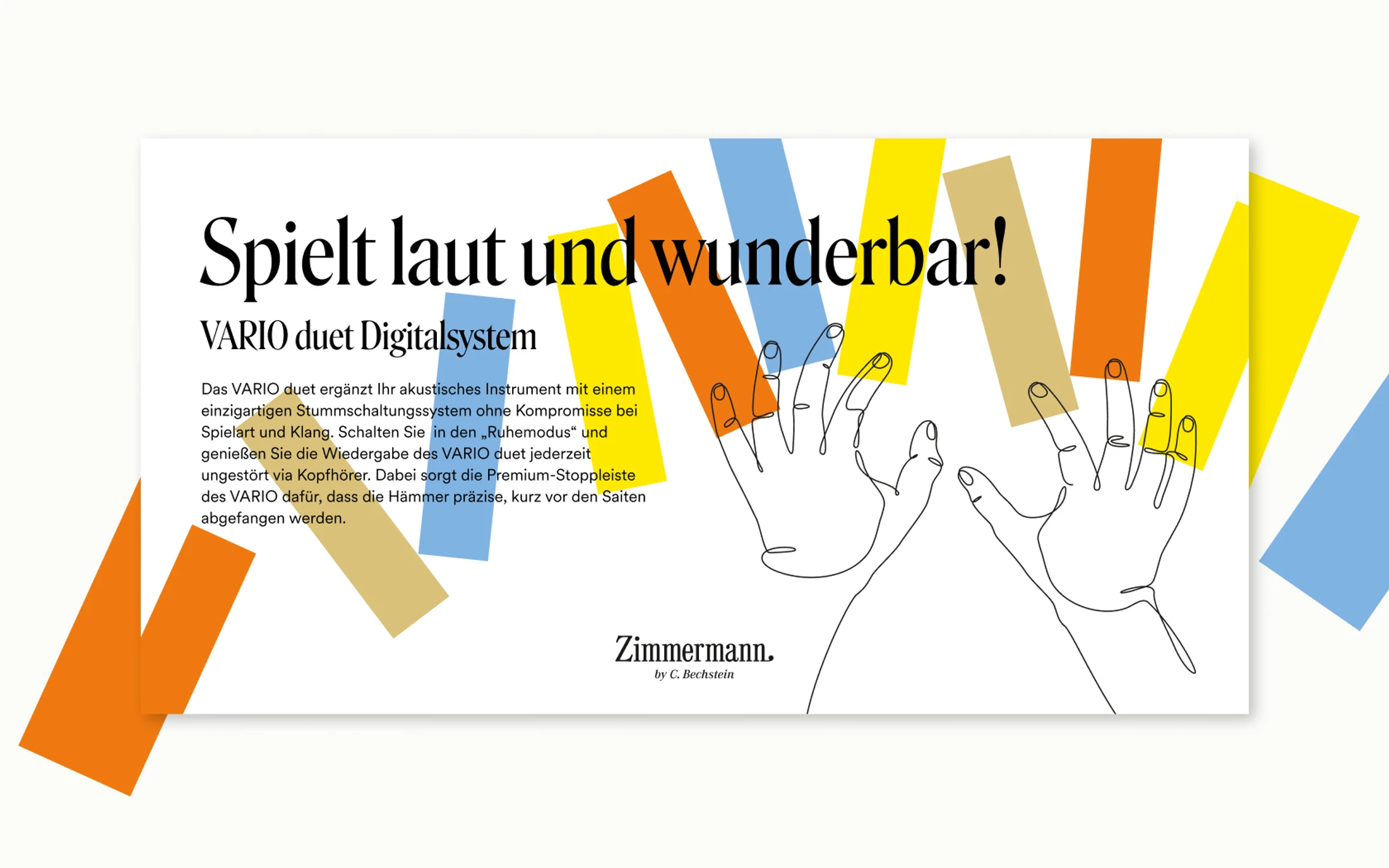 Preisgünstige Qualitäts-Flügel und -Klaviere von C. Bechstein heißen Zimmermann. Und wurden als erste Klaviermarke dort positioniert, wo sie hingehören: in junge Familien. Nach den Tone of Voice Guidelines für die Marke durfte ich auch die erste Rutsche Kommunikationsmittel für Zimmermann volltexten.