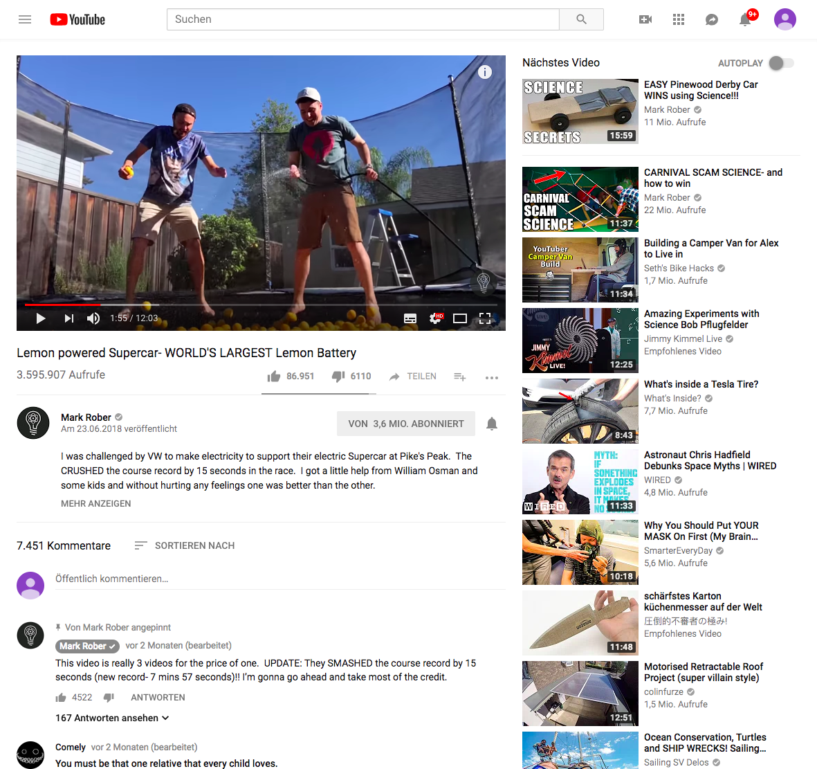 Auch Volkswagen Motorsport geht mit der Zeit und setzt auf Elektro-Mobilität. Weil die Formel E zu langweilig und alle anderen Rennserien zu benzingetrieben sind, beschloß man, den legendären Pikes Peak International Hillclimb zu gewinnen. Der PPIHC ist das zweitälteste Motorsport-Ereignis der USA und führt an tiefen, tiefen Abgründen vorbei durch 156 Kurven auf 4.300 Meter Seehöhe. Das Problem: Die Zielgruppe für Volkswagens neue I.D. Modellreihe interessiert sich nicht besonders für Motorsport und tödliche Abgründe. Deshalb mussten wir eine andere Geschichte erzählen. Gemeinsam mit Nasa Ingenieur, Jimmy Kimmel-Spezi und Youtube Star Mark Rober haben wir uns um die „Tankfüllung“ des Rekord-Fahrzeugs gekümmert.
